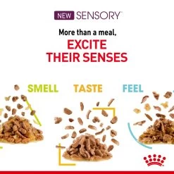 Although cats have very few taste buds meaning their sense of taste isn’t the strongest, it is still uniquely specialised. Due to their carnivorous predisposition, cats are sensitive to the meaty flavours associated with savouriness; so even though their taste range is smaller, they still have a perceptive sensitivity to taste. Your cat’s health and wellbeing is enhanced when their diet is not only nutritious, but sensorially varied too. ROYAL CANIN® Sensory Taste formulas are crafted with powerful flavours characterised by toasted, meaty, and caramelised traces that stimulate your cat’s unique sense of taste, turning their feeding ritual into a sensorially-rich experience. To cater to each cat’s individual preferences, ROYAL CANIN® Sensory Taste is also available with morsels in jelly for optimal texture variety. Other products in the ROYAL CANIN® Sensory range include Sensory Smell and Sensory Feel, each with its own attractive formula to stimulate your cat’s appetite and create a sensorially rich feeding experience. This formula is specifically designed to match the optimal Macro-Nutrient profile that is instinctively preferred by adult cats. This formula also contains a combination of nutrients that help support the health of your adult cat’s urinary system. Mixed feeding both wet and dry food gives your cat a variety of textures, helping to stimulate their appetite even more. A diet that is a mixture of wet and dry food is also a good option for fussy eaters. Be sure to follow the correct rationing amount to ensure healthy portions. The Sensory™ wet range can be integrated into the mixed feeding routine of all our Feline Health Nutrition Adult dry products. At ROYAL CANIN® we’re committed to providing nutritional solutions to your pet’s needs. All of our products undergo an extensive quality control process in order to guarantee the optimum quality of food as well as catering to your cat’s specific dietary requirements and lifestyle. This means that when your cat eats ROYAL CANIN® Sensory Taste, it’s getting a complete and balanced diet.