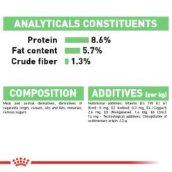 Composition: Meat and animal derivatives, derivatives of vegetable origin, cereals, oils and fats, minerals, various sugars. Crude ash: 1.9%. Crude fibre: 1.3%. Crude oil fats: 5.7%. Moisture: 0%. Protein: 8.6%.