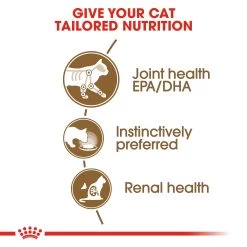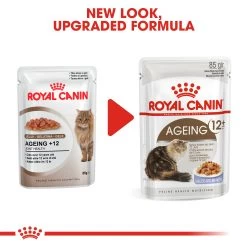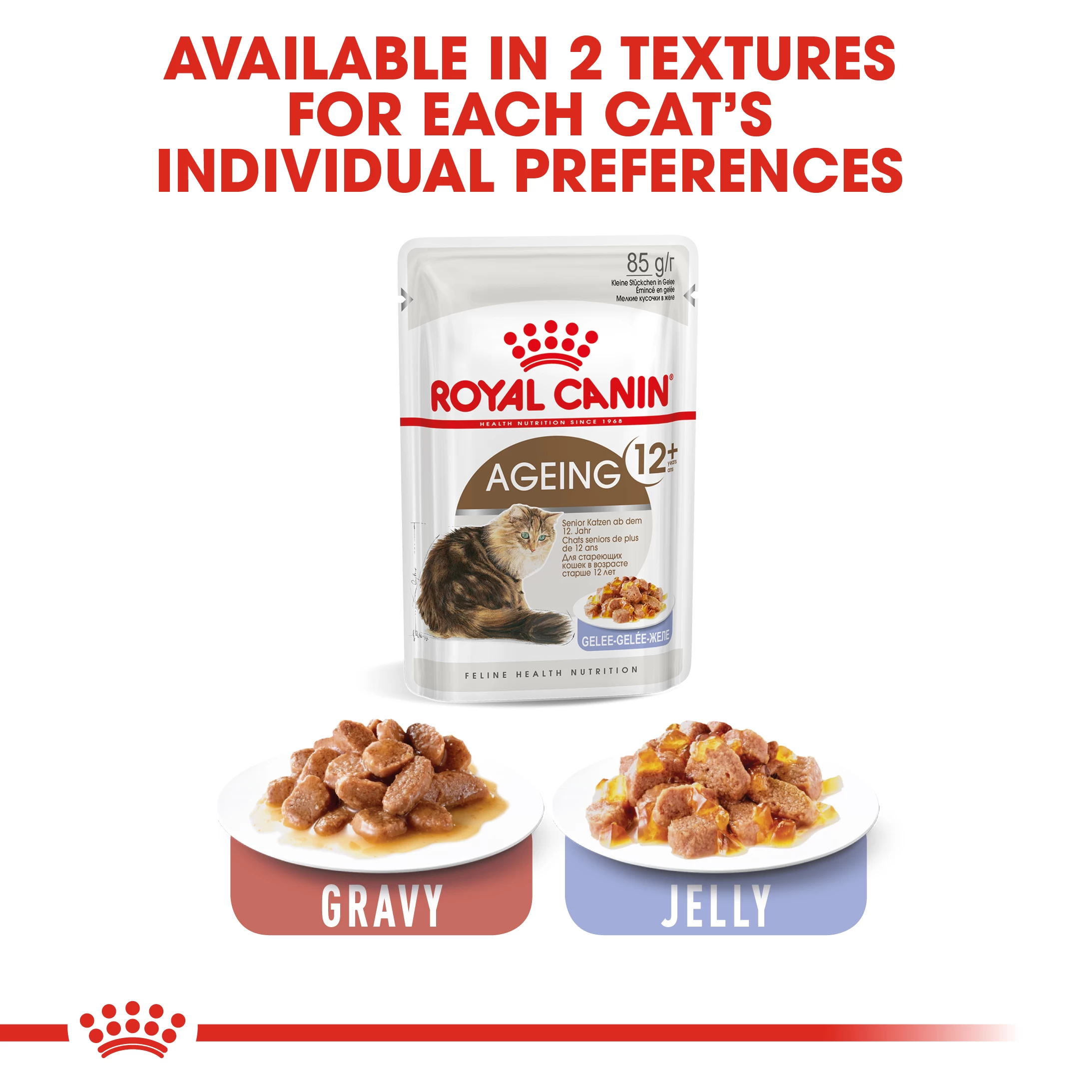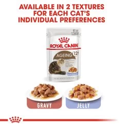 As your cat enters its senior years, its body – particularly its joints – will need even more support through nutrition to help maintain overall health. However, along with the changes in the type of nutrition your cat will require, the type of food it instinctively prefers will also change. To ensure that your senior cat (aged 12+) receives the specific nutrition it needs to help maintain optimal health, you will also need to feed it a diet that it will consume naturally and preferentially. Essentially, the right nutrition will only be able to support optimal health if it is within a food that is precisely crafted for regular and instinctive consumption. That’s why ROYAL CANIN® Ageing 12+ in Jelly is formulated to match the optimal Macro Nutritional Profile that is instinctively preferred by ageing cats like yours. The joint health of senior cats is paramount to their ability to partake in physical activity and maintain good overall health – which is why they typically need higher levels of nutritional support. ROYAL CANIN® Ageing 12+ in Jelly provides senior cats with specially formulated food to help maintain healthy joints through a high level of Omega-3 fatty acids – specifically EPA and DHA. ROYAL CANIN® Ageing 12+ in Jelly also contains an adapted phosphorus content to help support healthy kidney function and overall renal health. To cater to each cat’s individual preferences, ROYAL CANIN® Ageing 12+ is also available in a delicious gravy, or as dry food with tasty and crunchy kibble. If you’re considering mixed feeding, simply follow our feeding guidelines to ensure your cat gets an accurate amount of both wet and dry food for optimal benefit. At ROYAL CANIN® we’re committed to providing nutritional solutions to your pet’s needs. All of our products undergo an extensive quality control process in order to guarantee the optimum quality of food as well as catering to your cat’s specific dietary requirements and lifestyle. This means that when your cat eats ROYAL CANIN® Ageing 12+ in Jelly, it’s getting a complete and balanced diet.