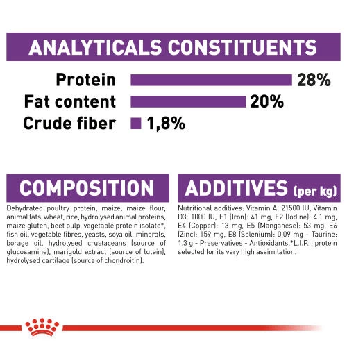 Composition: Dehydrated poultry protein, maize, maize flour, animal fats, wheat, rice, hydrolysed animal proteins, maize gluten, beet pulp, vegetable protein isolate*, fish oil, minerals, vegetable fibres, soya oil, yeasts and parts thereof, borage oil, hydrolysed crustaceans (source of glucosamine), marigold extract (source of lutein), hydrolysed cartilage (source of chondroitin). Crude ash: 5.3%. Crude fibre: 1.8%. Crude oil fats: 20%. Moisture: 0%. Protein: 28%.
