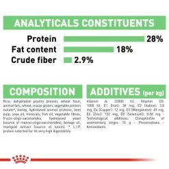 Dehydrated poultry protein, rice, wheat flour, animal fats, vegetable protein isolate*, wheat, hydrolysed animal proteins, barley, maize gluten, vegetable fibres, beet pulp, fish oil, soya oil, minerals, psyllium husks and seeds, borage oil, marigold extract (source of lutein), hydrolysed crustaceans (source of glucosamine), hydrolysed cartilage (source of chondroitin). *L.I.P.: protein selected for its very high assimilation.