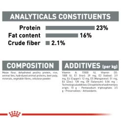 Composition: Maize flour, dehydrated poultry protein, rice, animal fats, hydrolysed animal proteins, beet pulp, minerals, vegetable fibres, cellulose powder. Crude ash: 6.9%. Crude fibre: 2.1%. Crude oil fats: 16%. Moisture: 0%. Protein: 23%.