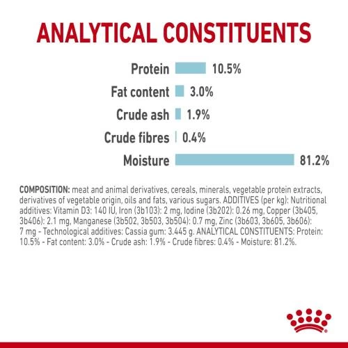 Meat and animal derivatives, cereals, minerals, vegetable protein extracts, derivatives of vegetable origin, oils and fats, various sugars. Crude ash: 1.9%. Crude fibre: 0.4%. Crude oil fats: 3%. Moisture: 81.2%. Protein: 10.5%.