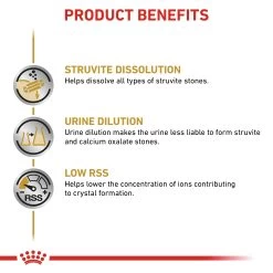 RECOMMENDED FOR CASES OF; Struvite uroliths: dissolution and management of recurrence, Calcium oxalate uroliths: management of recurrence, Bacterial cystitis: management of secondary struvite crystalluria (in association with adequate antibiotherapy). NOT RECOMMENDED IN CASE OF; Chronic Kidney Disease (CKD), Heart disease (when sodium restriction is sought), Concurrent use of urine-acidifying medication, Growth, gestation/lactation.
