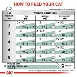 Royal Canin Veterinary Diets Diabetic Wet Cat Food is a complete dietetic feed for cats formulated to regulate glucose supply (Diabetes Mellitus). This feed contains a low level of rapid glucose-releasing carbohydrates.