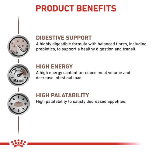 Royal Canin Veterinary Diets Gastrointestinal Dog Food is a complete dog food designed to aid dogs suffering with intestinal absorption disorders. Densely packed with easily digested energy and elevated levels of vitamins, minerals, and electrolytes, Royal Canin’s Gastro Intestinal formula is ideal for dogs afflicted with inflammatory bowel disease, chronic or acute diarrhoea, malabsorption, maldigestion, exocrine pancreatic insufficiency, gastritis, colitis, small intestinal bacterial overgrowth, anorexia, or loss of appetite.