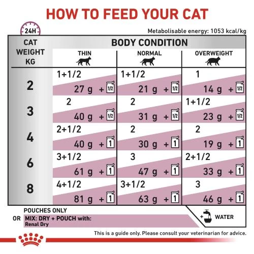 ROYAL CANIN Renal provides a low phosphorus content and a number of high-quality proteins to help support kidney health and function. ROYAL CANIN Renal has an adapted energy content which helps to reduce the volume of your cat’s meal, ultimately supporting their reduced appetite. This formula contains a specific aromatic profile to appeal to your cat’s individual preferences and help to stimulate their appetite. To cater to each cat’s individual preferences, ROYAL CANIN Renal comes in a variety of formulations: beef, fish, and chicken. It is also available as a dry food product with tailor-made kibble.